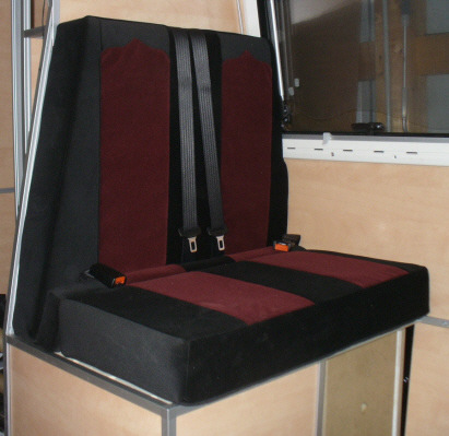Sitzbanksystem mit 2 dreipunkt-Gurten. Tüv-Eintragung in nahezu alle Kastenwägen möglich. Die Sitzbank kann individuell für das Fahrzeug passend gefertigt werden. Durch verschiedene Gurtbocksysteme können wir für fast alle Einbausituationen das passende Element anbieten. |